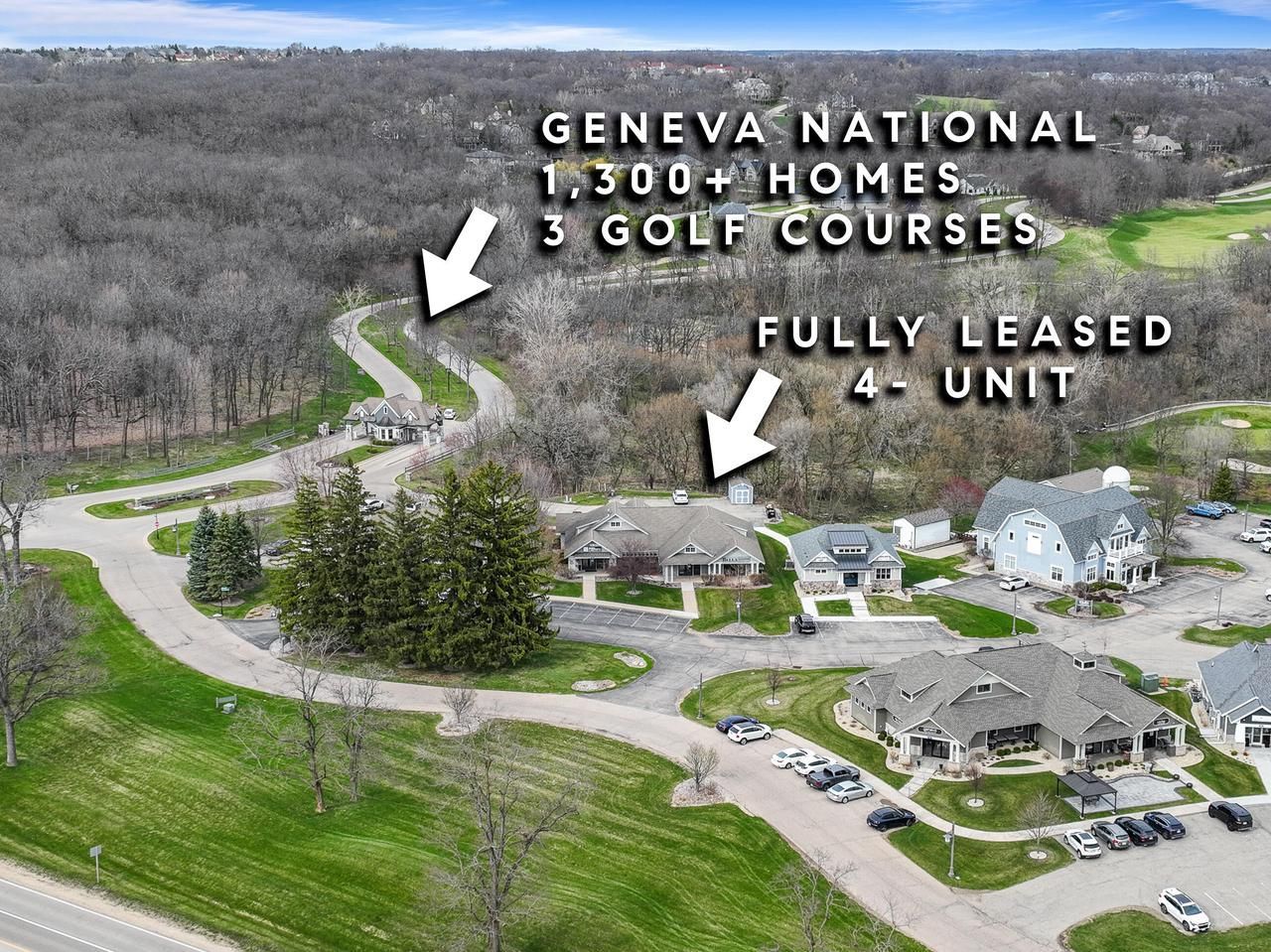 At the entrance to Geneva National, where championship fairways meet the shores of Lake Como, a stabilized, fully leased business condominium comes to market for the very first time. A passive investor's ideal hold: Free standing bldg w 4 units totaling 4,080 SF leased to two proven tenants through 2028, delivering day-one cash flow. Geneva Cabinet Company and Bella Tile and Stone are long-established businesses rooted in the Geneva Lakes market. Adjacent to three championship courses by Arnold Palmer, Gary Player, and Lee Trevino. This 1,300+ home resort is two-thirds built out with hundreds of acres for future expansion. Minutes from Lake Geneva, Williams Bay, and Geneva Lake with access to Hwy 50, 67 and I-43. Stone and shake-shingle construction, pergola patio, golf course views.