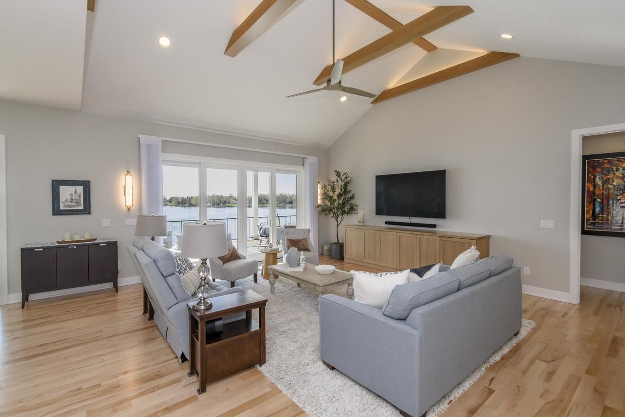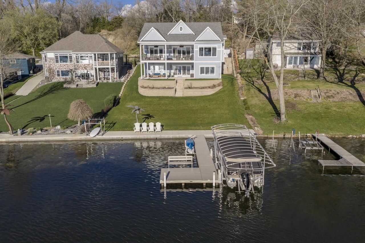 Indulge in refined lakefront living on Blue Spring Lake in this exceptional newer construction home. Boasting 5 bedrooms & 3 full baths, this meticulously crafted home is bathed in natural light and captures breathtaking panoramic lake views. Rich maple hardwood floors pair beautifully with multiple Solatubes, creating a bright, sophisticated ambiance. The gourmet kitchen is a showpiece, featuring granite countertops, exquisite Amish-crafted cabinetry, a Subzero refrigerator, & Advantium multi-oven with seamless WiFi integration. Spa-inspired baths showcase elegant quartz finishes. Designed for effortless entertaining, the walkout lower level leads to a lakeside patio, while the upper composite deck offers gas heaters & hook-ups for elevated outdoor living. Zero entry walk in from garage.